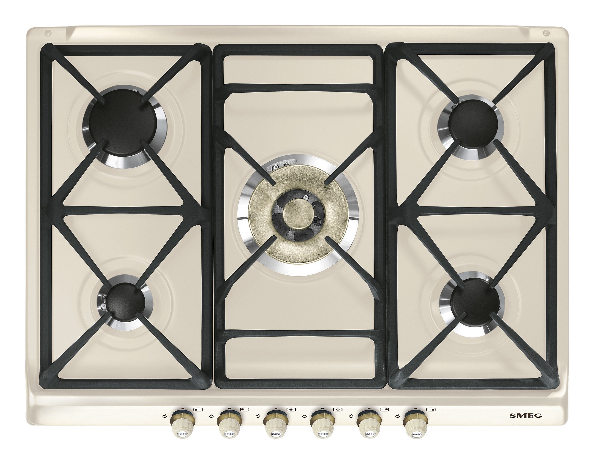 Plotis: 70 cm automatinis uždegimas apsauga nuo dujų nutekėjimo Wok degiklis valdomas dviem rankenėlėmis ketiniai puodų laikikliai valdymas priekyje kremo spalva žalvario spalvos apdaila