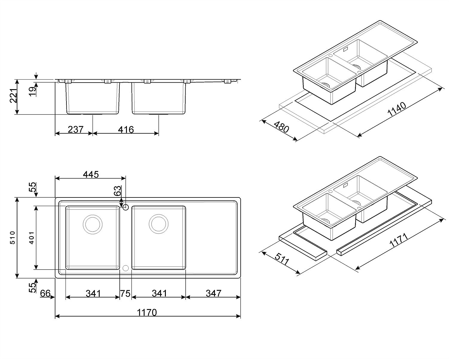 • Plautuvės matmenys: (A x P x G) 221 x 1170 x 510 mm