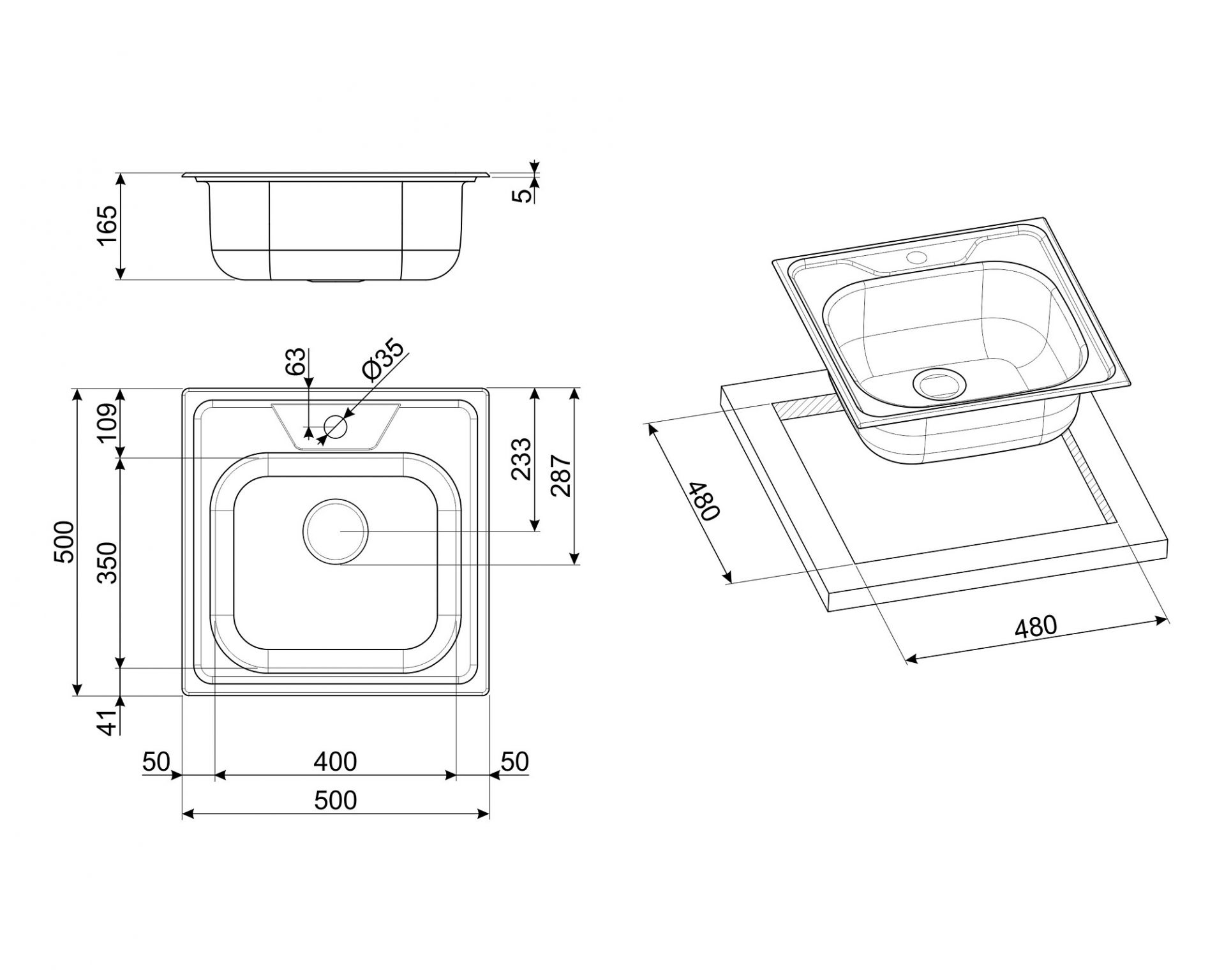 • Stalviršio išpjovos matmenys: (P X G) 480 x 480 mm