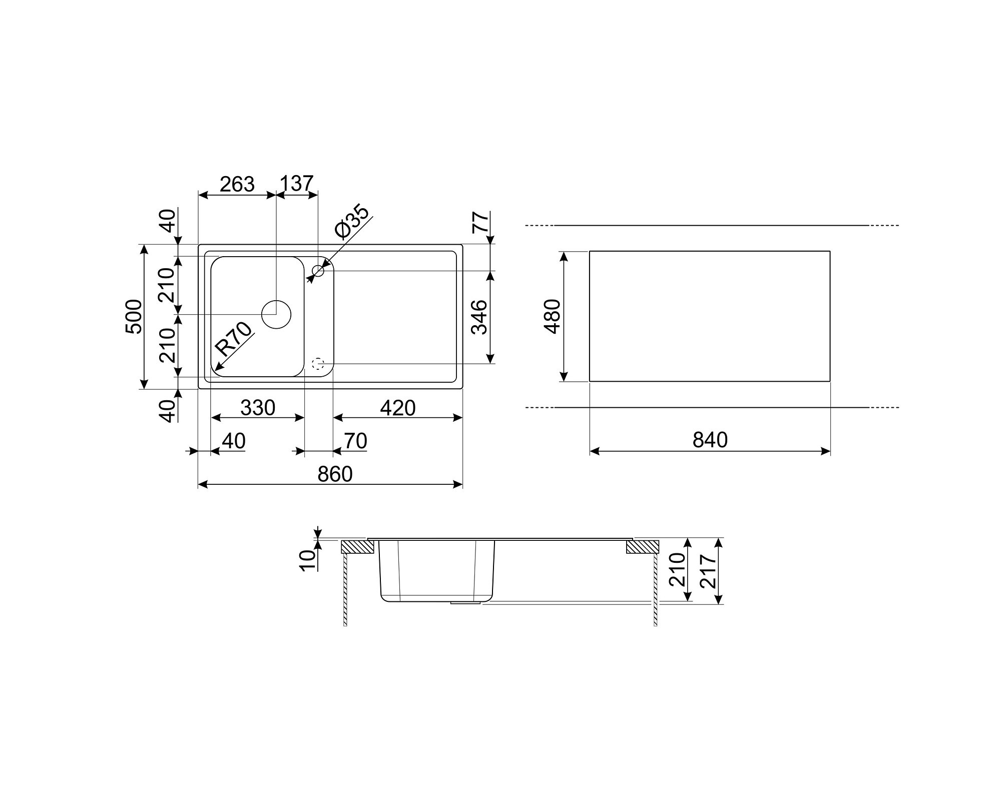 Matmenys: 860x500 mm dubens 330x420 mm dubens gylis 210 mm lengvas valymas paviršius atsparus įbrėžimams apsauga nuo perpylimo uždaromas ventilis 3,5" balta spalva montuojama į min. 45 cm spintelę