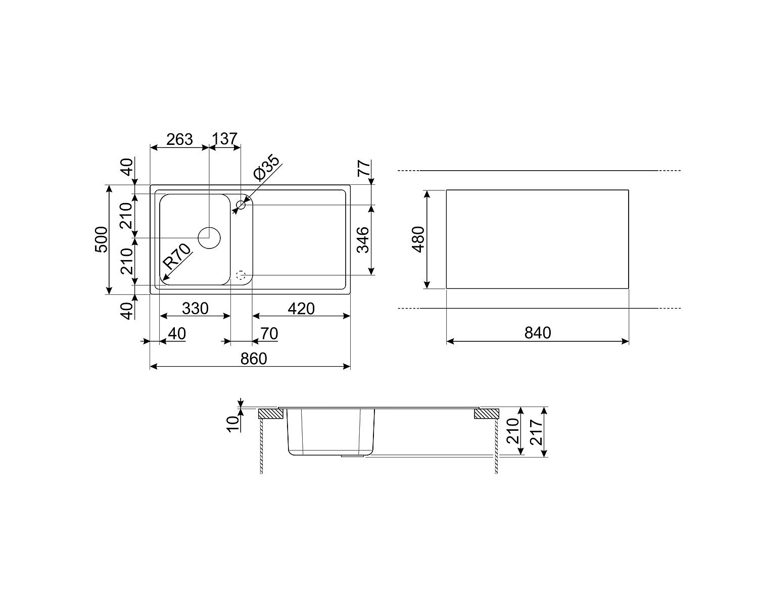 Matmenys: 860x500 mm dubens 330x420 mm dubens gylis 210 mm lengvas valymas paviršius atsparus įbrėžimams apsauga nuo perpylimo uždaromas ventilis 3,5" kremo spalva montuojama į min. 45 cm spintelę